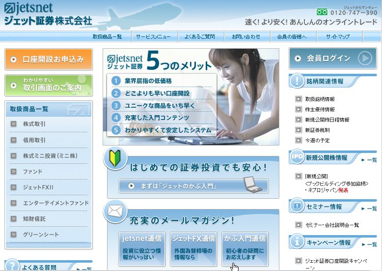 ジェット証券を徹底解説ジェット証券株式会社(以下「ジェット証券」)とオリックス証券株式会社(以下「オリックス証券」、URL: http://www.orix-sec.co.jp/)は、オリックス証券を存続会社として、2009年3月29日(日)をもって合併※することとなりました。「ジェット証券」ってあまり有名じゃないから、どうなのかしら?って 思う人が多いかもしれません。 でも、私がネット証券で一番に口座を作ったのは、ここでした。 もう、4年以上前ですね。その当時、手数料が1番安かったのです。 100万円以下は 777円 という驚きの安さでした。 当時は他のネット証券は安くても2000円くらいはしていたと思います。 今でこそ、Eトレード証券とか、楽天証券とかが、手数料を値下げして 有名になっていますが、ここが驚くほど手数料を安くした最初のネット証券 なのです。 設立日 1999年9月22日で、創業以来、安定して稼動しているシステムには定評があり、コールセンターもあります。。 最近、また手数料の値下げをしたので、手数料の安さでは 見劣りしません。 それに、なんといってもここの売りは 「画面がすごーくやさしくて、パソコンが苦手な人でも簡単に注文が 出せれる」ってところです。 特に女性には向いているネット証券だと思います。 実は、つい最近、ジェット証券のサイトがリニューアルされました。 前の画面が結構、気に入っていたのでちょっとショックでしたが、 今度の画面もなかなかわかりやすくて使いやすいです。 ![]() サイトはこんな感じです。 どうですか? どこから、ログインしたらいいか、すぐわかるでしょう? わりと、他の証券会社ではわかりにくいところが多いんですよ。 右上の会員ログインというところからログインします。 また、左上に「わかりやすい取引画面のご案内」というところがあります。 そこをクリックすると、 ![]() 「買い注文をする」や「売り注文をする」などの表示が文字で出ますので 迷うことなく、注文できます。 お取引メニューも、ばつぐんのわかりやすさです。 初心者でも、迷うことがありません。 ![]() また、ジェット証券の「かぶ入門」というコンテンツは、 初心者向けにとてもわかりやすく説明してあります。 初心者の方はここを読むと株のことがよくわかります。 一番、ほっとするのは、「売買報告書」ですね。 ほとんどのネット証券は、売買報告書が電子交付でないとダメになっている ようです。でも、ジェット証券は、ちゃんと取引するたびに、 売買報告書を送ってくれます。これはいいですよ。 いちいち、電子交付の画面をチェックしてプリントアウトしなくても いいのですから。 また、あらかじめ登録しておけば、売買が成立したときに、登録した携帯電話のアドレスに売買成立のメールが届きます。 これは、楽天証券よりも早いスピードでメールがきます。 私も、メインで使っていて、すごく使い勝手がいいです。 2度ほど、わからないことがあって、電話をしたこともあるのですが、 とても丁寧に答えてくれたので、好印象を持ちました。 あと、ターゲットメールに登録しておくと、登録しておいた銘柄が 買いたい(売りたい)値段になったときに、メールでお知らせしてくれる サービスもあります。 それから、パソコンが調子悪くなって、どうしても注文を出したいときには 電話で注文を受け付けてくれるサービスもあります。 手数料は、約定代金の0.42% 最低手数料2,100円 最高手数料42,000円 となっています。 でも、携帯電話から注文が出せるので、ほとんど必要はないと思いますが いざという時には安心ですよね。 手数料についての説明手数料体制については、2005年12月1日約定分より、オンライン専業証券で初めて、「ベーシックプラン(1注文の約定代金に応じた手数料)」と「ワンデイパックプラン(約定回数に関係なく1日の約定代金に応じた手数料)」の料金プランの変更を毎営業日、変更できるようなりました。 前営業日の16:00までに変更すれば、翌営業日の取引に適用される手数料プランが新しいプランに変更になります。また、翌々営業日に元に戻すことも可能です。 ベーシックプラン 1注文の約定代金 手数料 50万円まで ・・・・・・・・・420円 50万円超 100万円まで ・・・・735円 100万円超 200万円まで ・・ 997円 200万円超 300万円まで・・ 1260円 300万円超 3000円まで・・・ 1365円 ↑ 営業日ごとに ご選択 が可能です ↓ ワンデイパックプラン 1日の約定代金の合計 手数料 200万円まで 1,050円 400万円まで 2100円 600万円まで 3150円 以降200万円ごとに 1,050円追加となります メリット1:市場 【東証・大証・JASDAQ・マザーズ・ヘラクレス】 メリット2:取引 【現物・信用】 メリット3:注文 【成行・指値・出来ず大引け・大引け】 にかかわらず 同一の手数料体系です。 ジェット証券取扱商品について 東証 大証 JASDAQ マザーズ ヘラクレス RIET ETF ベンチャーファンド 外国株 ◎ ◎ ◎ ◎ ◎ ◎ ◎ ◎ × 提携銀行 三井住友銀行 三菱東京UFJ 上の2つの銀行はインター