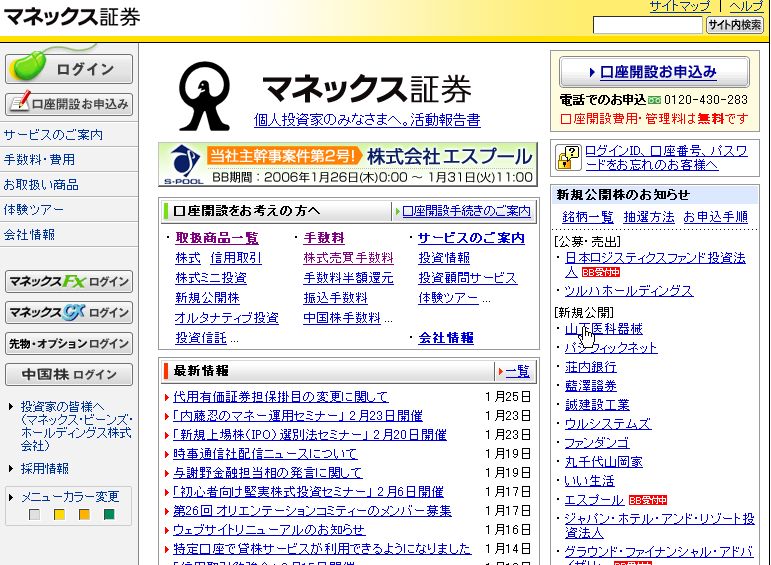 マネックス証券を徹底解説1999年にソニーなどが大株主になって設立されたネット専業証券会社。2004年8月に日興ビーンズ証券と経営統合して、マネックス・ビーンズ・ ホールディングスとして東証マザーズに上場しました。 ![]() ここの一番の特徴は「マネックス・ナイター」という夜間取引でしょう。 「マネナイ」とも呼ばれています。 夜間取引とは 夜間(17:30〜23:59)でも取引ができます。 夜間取引の手数料は株数に関わらず一約定につき500円(税込)です。 また、逆指値・ツイン指値で注文を出すことができます。 「逆指値」とは通常の指値注文とは逆で、指定した価格より株価が高くなったら「買い」、安くなったら「売る」ことができます。うまく使えばリスクを最小限に抑えたり、一定の条件で利益を確保することができます。 「ツイン指値」とは利益確保のための指値注文とロスカットのための逆指値注文を同時に出すことができるので、リスクとリターンをコントロールできます 注文の期限も他の証券会社がだいたい今日中か週中なのに対して 期間指定30日 までの長い期限で注文を出すことができます。 ネット証券ではめずらしくミニ株ができます。 単元株では大きい金額がいってなかなか買えない株もミニ株なら 1/10で買うことができます。 【参考】2005年11月21日の終値で最低売買単位を買付けるための必要資金 (手数料等含まず) ベネッセ・・・38万円→ミニ株で 3万8千円 良品計画 ・・・43万円 → 4万3千円 ソニー ・・・75万円→ 7万5千円 花王 ・・・286万円→ 28万6千円 株式ミニ投資の売買手数料は一約定につき 500円(税込)です。 ■マネックスラウンジ@銀座(銀座ソニービル4F)を利用できます。 ・ 仕事帰りや休日の買い物ついでにも立ち寄れる ・ コーヒーなどのお飲み物もご用意、くつろぎのスペース です。 ■ポイント制 があります。 ・ 株式売買手数料500円につき1ポイントがつきます(500円未満は切り捨て) ・ 1ポイント=5円相当なので、実質的に手数料の1%が還元されます。 ■貸し株制度があります。 ・ 貸株金利を受け取れます。 ・ 貸株サービス利用中でも、自由に売買できます。 ■新規公開株では公平な抽選をしています。 2005年度IPO取扱い実績 引受件数:89件 引受金額:109億円(1千万以下切り捨て) 主幹事:3件 マネックス証券では、コンピューターで無作為に抽選を行っています この過程はシステム化されており、人間の恣意が途中で関与することはありません。 以上のような女性や初心者にやさしいネット証券です。 ■取扱商品 株式(現物)、株式ミニ投資(ミニ株)、信用取引 新規公開株(IPO)、中国株 投資信託 、投信積立プログラム、オルタナティブ投資 上場投資信託(ETF、REITなど) 外貨建てMMF 債券 、為替保証金取引 (マネックスFX)、先物・オプション(日経225) カバードワラント 、商品先物取引(マネックスCX) ■インターネット株式売買手数料 (手数料はすべて税込です)